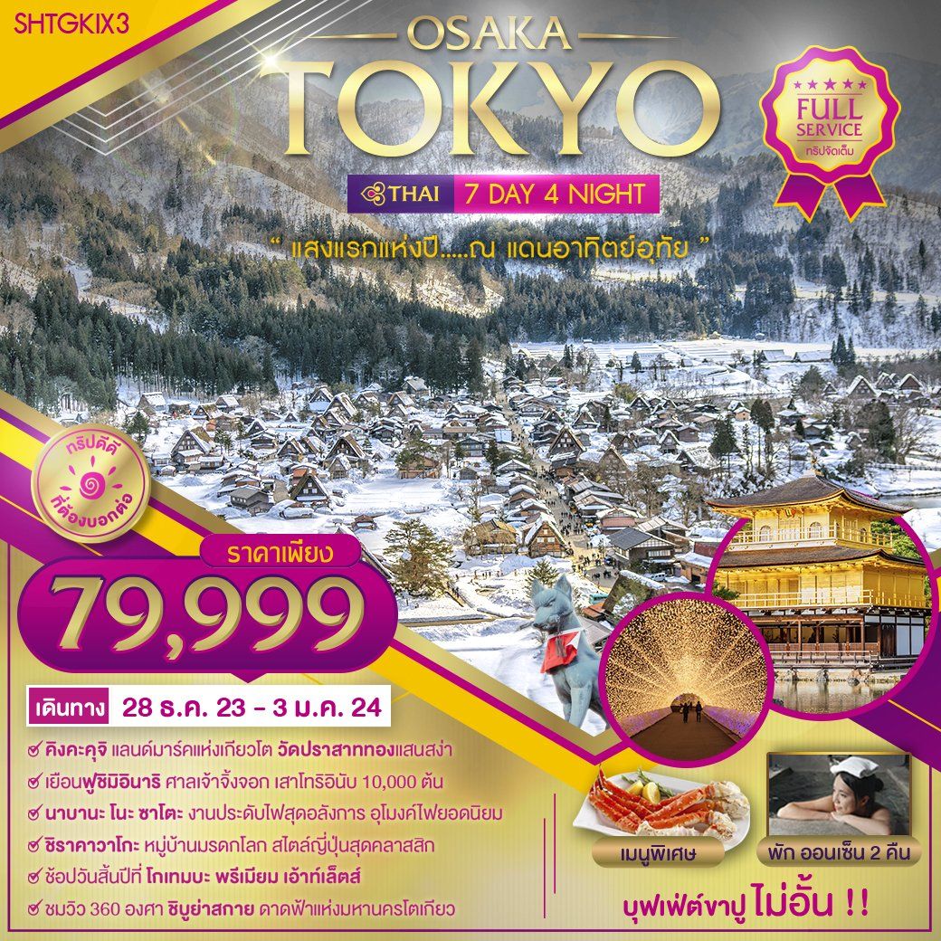อลังการไฟล้านดวง ณ หมู่บ้านนาบานะ โนะ ซาโตะ เพลิดเพลิน กิจกรรมฤดูหนาวพร้อมสัมผัสหิมะ ณ ลานสกีเมืองกุโจ (ขึ้นอยู่กับสภาพอากาศ) ชมหมู่บ้านมรดกโลกการันตีโดย UNESCO ณ หมู่บ้านชิราคาวาโกะ ชมปราสาททอง ณ วัดคินคะคุจิ แห่งเกียวโต หรือ วัดทอง หรือ วัดอิคคิวซัง ช้อปปิ้งจุใจ ย่านชินไซบาชิ พร้อมเช็คอิน ป้ายกูลิโกะแมน แห่งโดทงโบริ